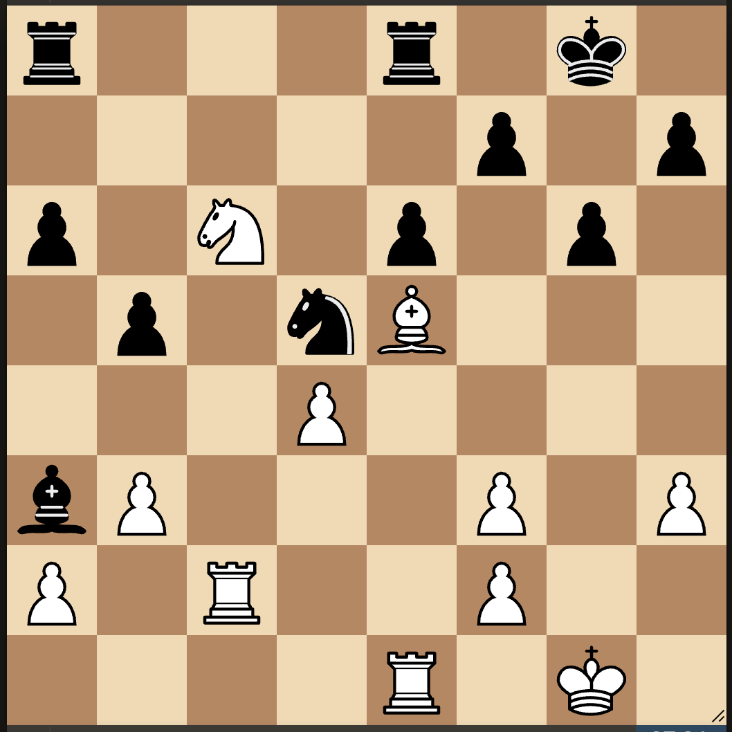 Here, I was a bit lazy. I saw some dangerous lines for myself after dxc3 (in both Rxg7 and Bxg7), and I also, thought my position after g6 was better than it actually was, so I didn’t see as much of a point in calculating dxc3 super deeply. (21... dxc3! It turned out the principled move was best, but I vaguely remember that one line really concerned me. 22. Rxg7+ This scared me more (22. Bxg7 Here, black should be able to draw in several ways, but I have to be accurate here, also. 22... Rd5 Is probably a cleanest draw. (22... cxb2? This natural move, however, loses for me after 23. Bxb2+ Kf8 24. Bg7+ Ke7 25. Rae1+ Kd7 26. Rg3! Bh5 27. Bf6) (22... c2) (22... Ne7)) 22... Kh8 (22... Kf8? 23. Re1) 23. Rg3!? { I vaguely remember seeing this, and thought I’m concretely in danger. However, I have an incredibly strong concrete equalizing solution which I didn’t see. } (23. Rxf7 Ne5 (23... cxb2)) 23... Rg8!! { I definitely didn’t consider this. } (23... Be4?! 24. Bg7+ (24. Bxc6! { Is even stronger. } 24... bxc6 25. Bg5 h5 26. Bxd8 Rxd8 27. Rxc3) 24... Kg8 25. Bf6+ Bg6 26. Bxd8 cxb2 27. Rb1 Rxd8 28. Bxc6 bxc6 29. Rxb2 Would be quite unpleasant for me.) 24. Rxf3 Ne5!! { Another very accurate move. (24... Nd4? { Is tempting but losing for black after } 25. Rd3! Nxb5 26. a4! cxb2 27. Rb1 Rg6 28. Bf4) 25. Rg3 (25. Rh3 Ng4+) 25... Ng4+ 26. Rxg4 Rxg4 27. Be3 cxb2 28. Rb1 Rb4 With rough dynamic equality.)