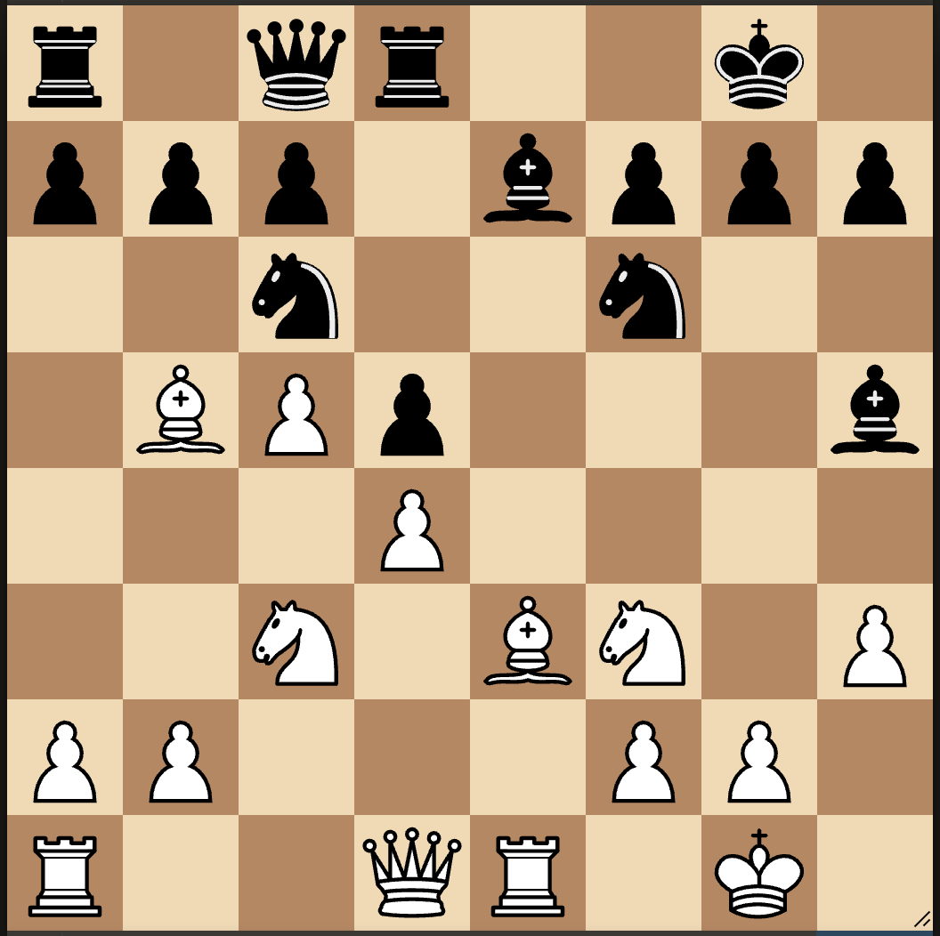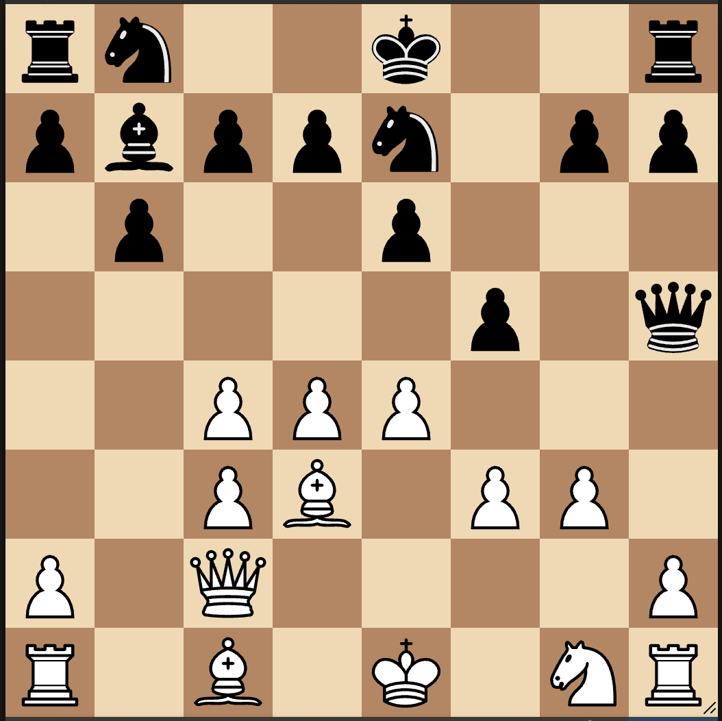 This is a line I have already played before, but it’s not the best line for Black, which I’m not likely to repeat. I didn’t even remember I played a game with Black here, until I checked the database after I finished my game against Eshaan. (9... fxe4 10. fxe4 d6 Is likely the best for for Black to play. Engine approves it, and in the small sample size in the database, black has scored 3/3 from here. 11. Ne2 e5 12. O-O Nh6 (12... Nd7) 13. Kg2 (13. c5) 13... Nd7 14. h3 Qg6 15. g4 Nf7 16. Ng3 h5 $15 { 0-1 (43) Nakada,A (2324)-Cordova,E (2549) Chicago 2022 And black went on to win in)