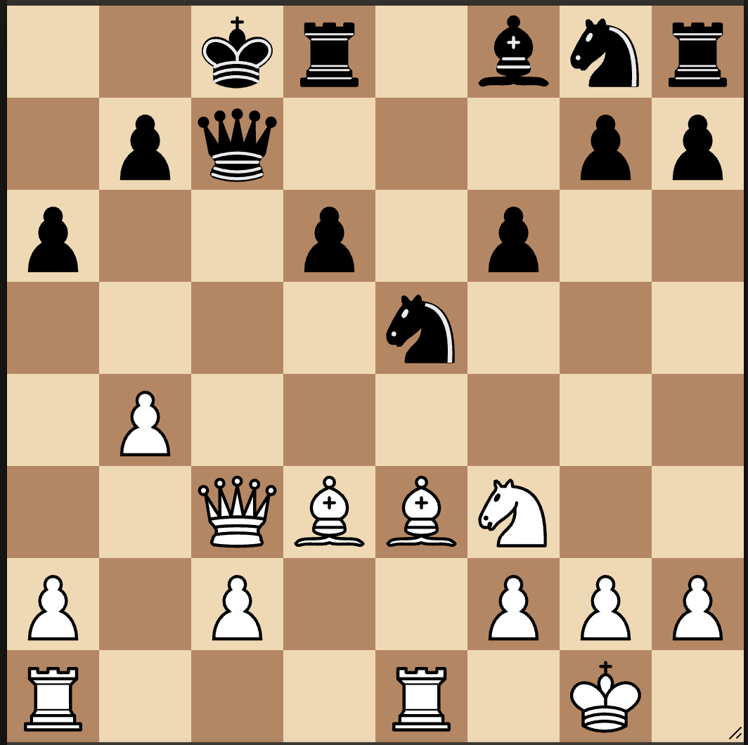 15... Bc8! From here on, I had total control of the game, and I made sure to never allow counterplay. Bc8 had a few ideas. One was to get my bishop to g4, from b7 where it wasn’t doing as much, and the other was to stop any potential counterplay for white with g4.