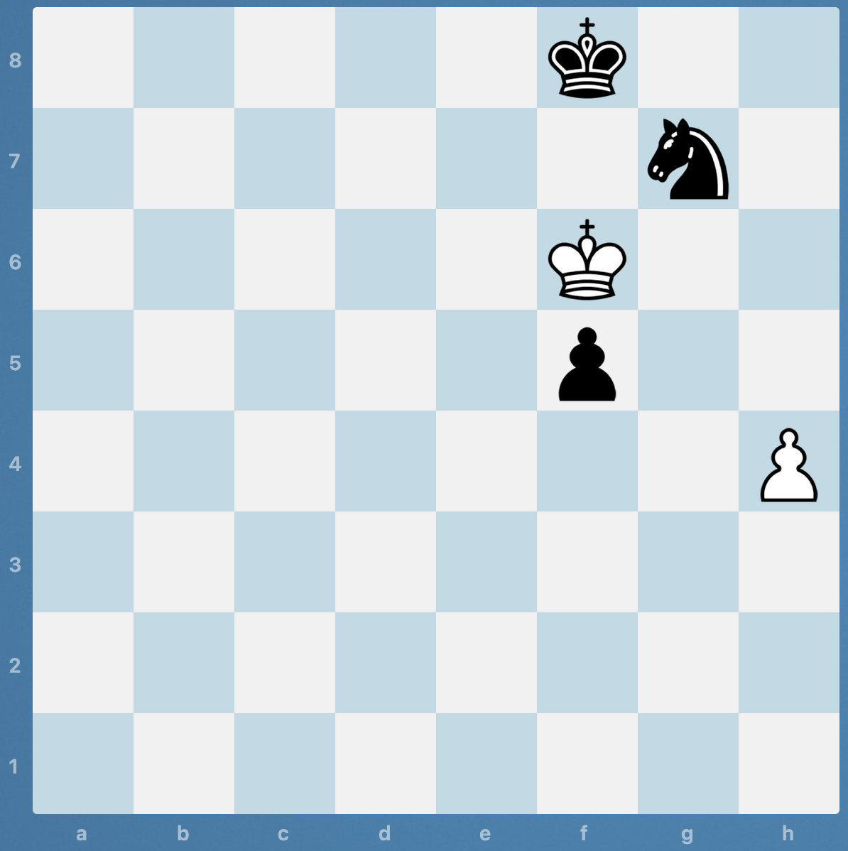 Kg5 Kf7 2.h5 Ke6 3.h6 Ne8 4.h7 Nd6 5.h8=N =