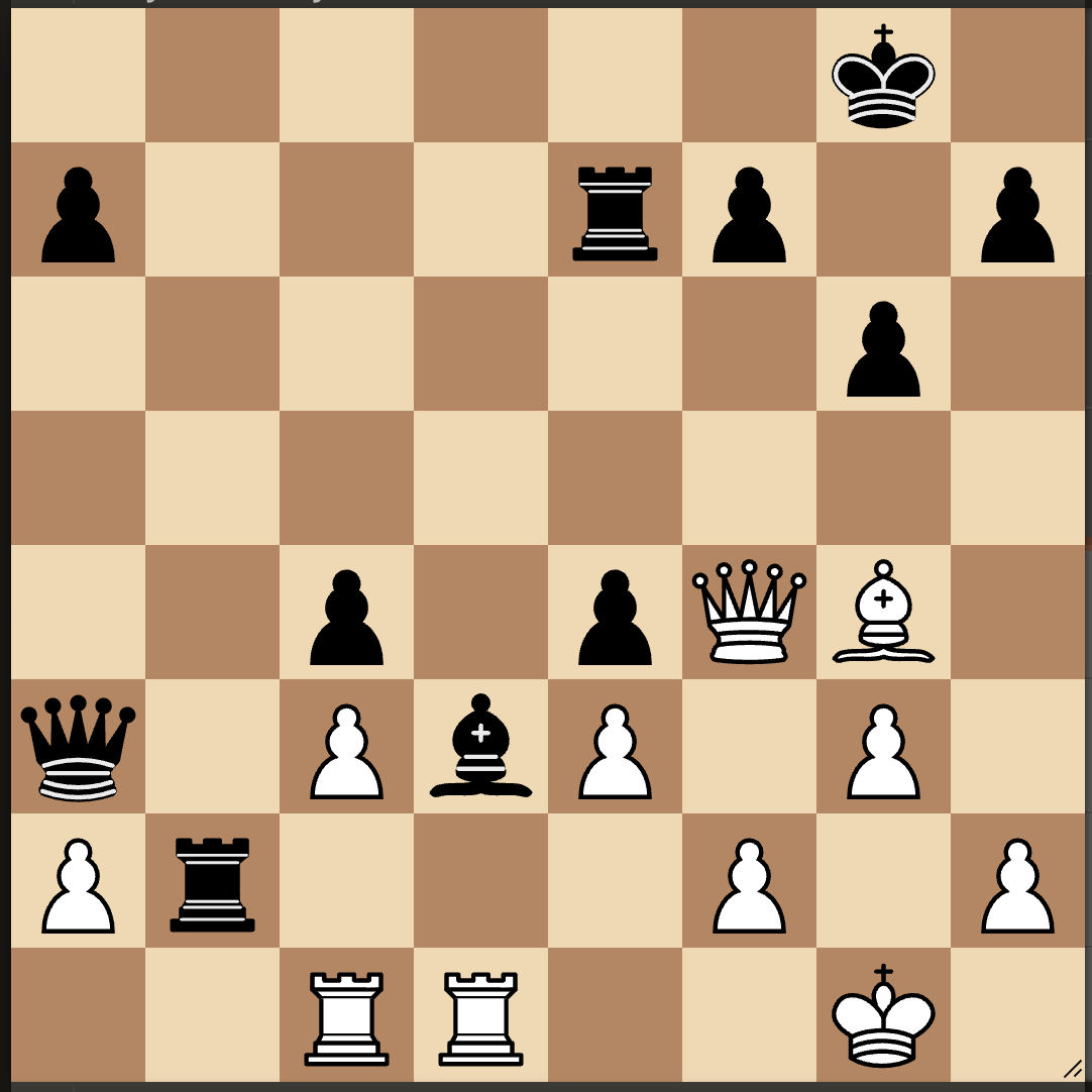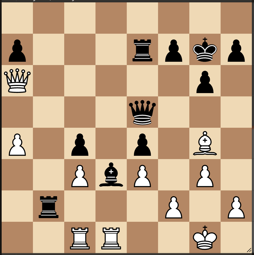 27. Qd1 Rd5 28. Qg4 Rdb5 29. Qf4 (29. Bxe4 loses to f5) 29... Qa3 30. Rdd1 Re8 31. Bh3 Rb2 32. Bd7 Re7 33. Bg4