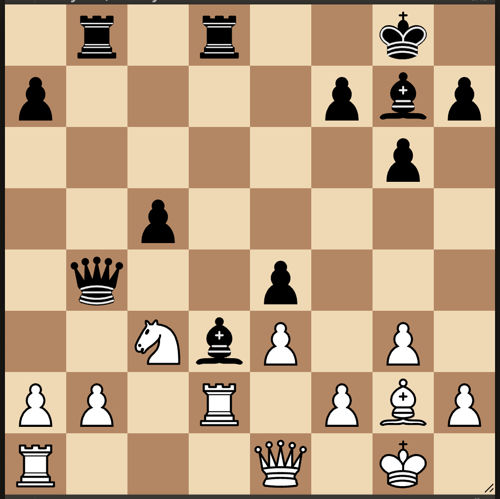 26. Rc1 c4 This diagram features in Gelfer’s book. Black has a beautiful anchored bishop on d3, in the heart of White’s position. If White trades it off, Black will instead have a far-advanced protected passed pawn. Black’s bishop on d3 is not attacking anything on its own, so assistance from queen and both rooks are needed. The bishop controls b1, allowing Black to use the b-file. The white pawns on a2 and c3 are the main targets, and White has no real counterplay.
