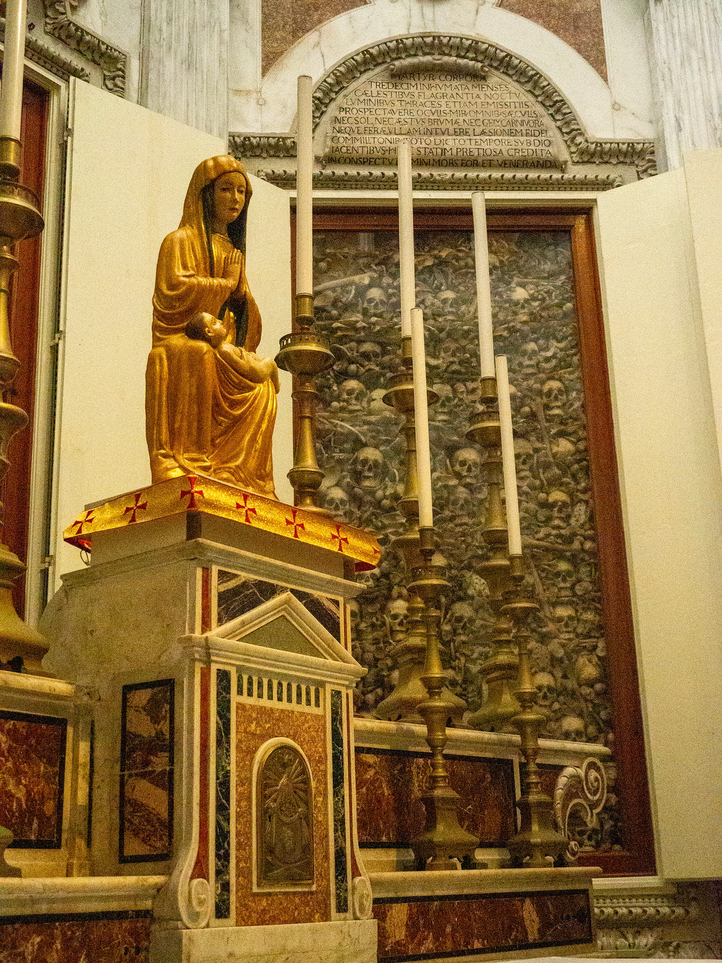 The human remains were….not so beautiful. I hadn’t read about the church’s history and was startled to see skulls piled up in glass cases behind the Virgin Mary. The skulls and bones of the Martyrs of Otranto, as they are known, date from 1480, when some 800 local men were killed by Ottoman invaders. The church was briefly turned into a mosque but reconverted to a church when the Ottomans were expelled in 1481.