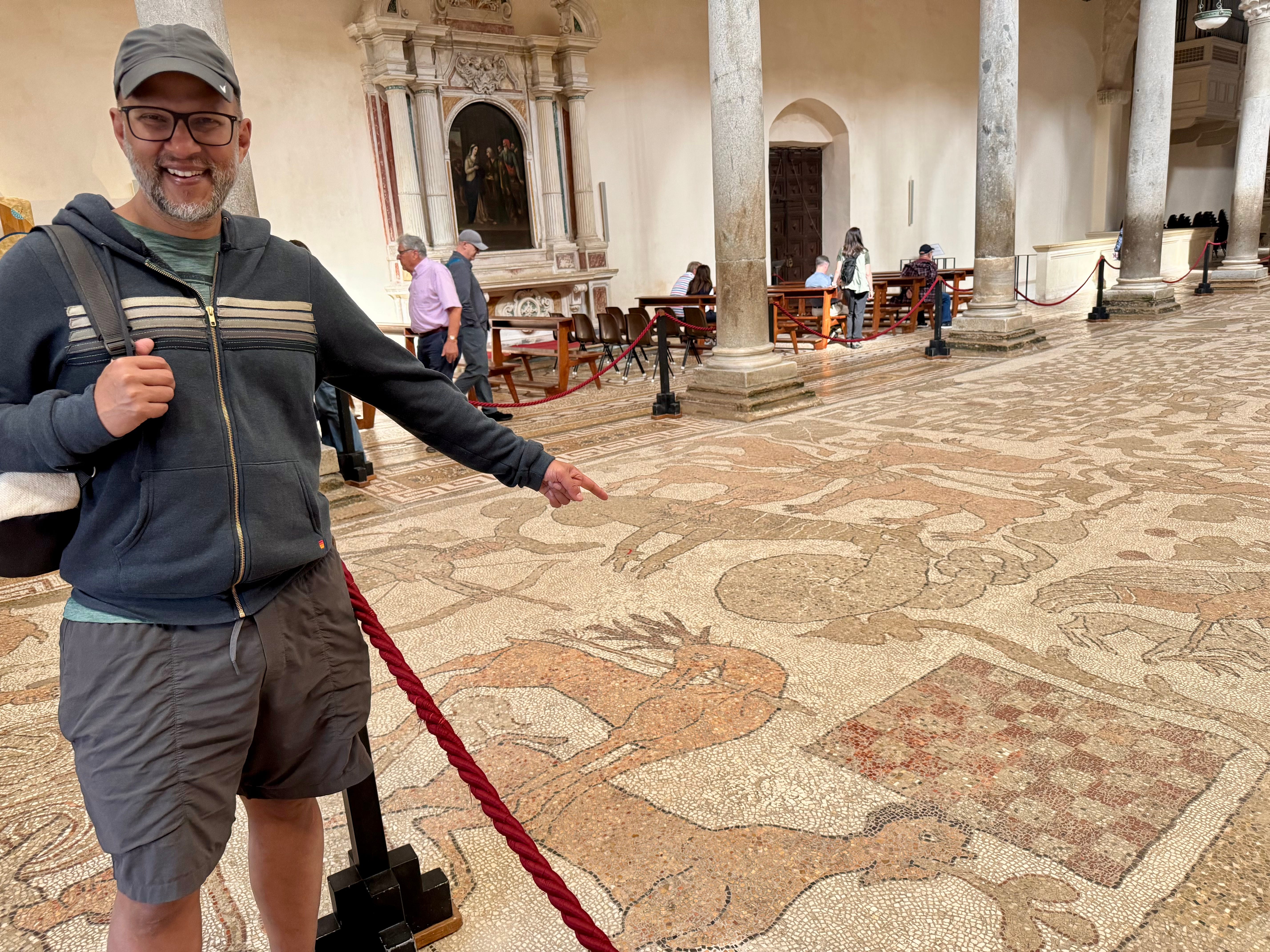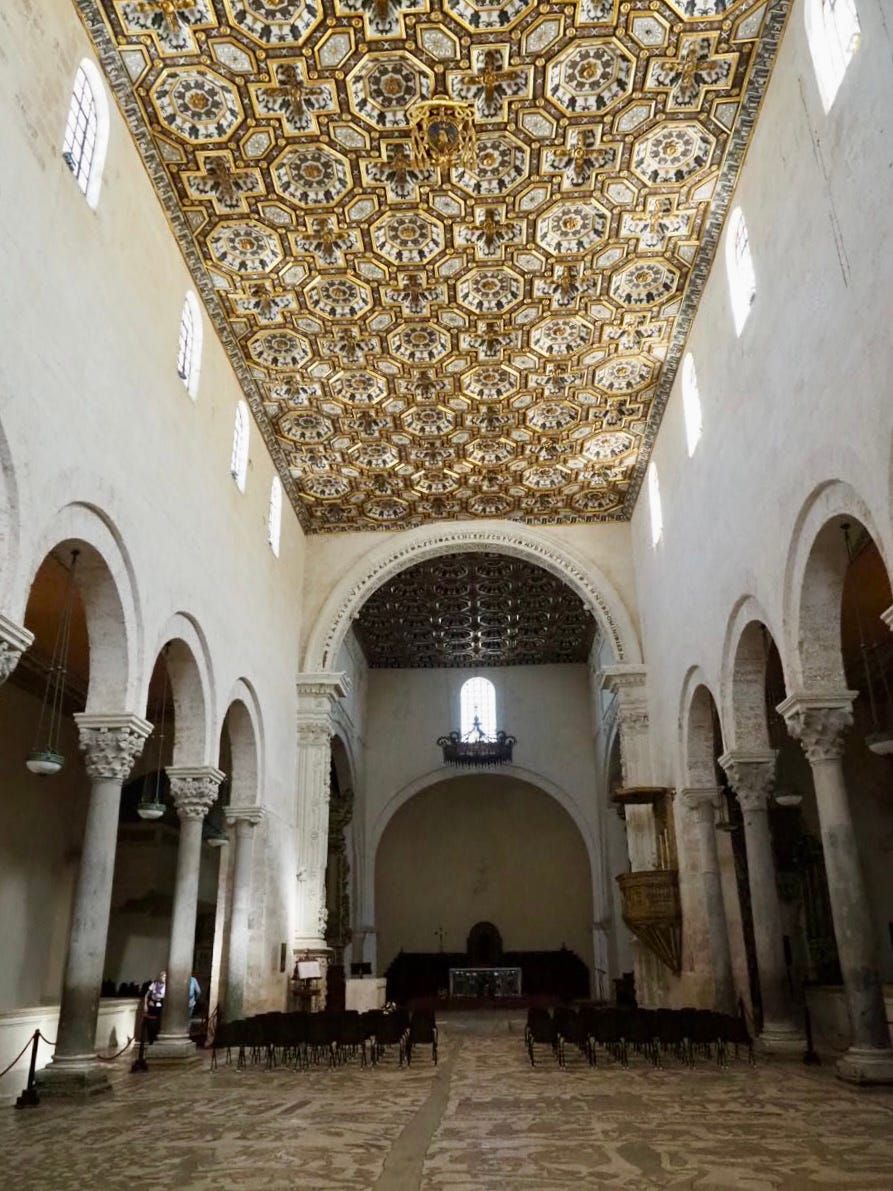 We loved Otranto, on the Adriatic coast of Salento, Puglia. We visited the medieval castle and then the Cathedral of Otranto, consecrated in 1088. After a while, church interiors started to look indistinguishable to me, but this one was unforgettable. Behind the plain exterior facade is an ornate floor mosaic that was created by a monk and features a giant Tree of Life. There are scenes from the Old and New Testaments, mythological creatures, horned devils, monkeys, kings, conquerors and yes, a chessboard! (Obviously very on brand for this trip). The church’s Moorish wooden ceiling is also beautiful.