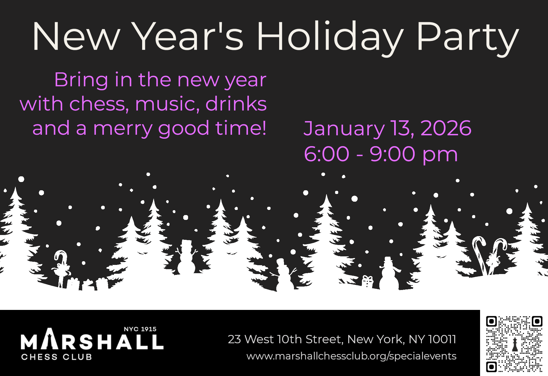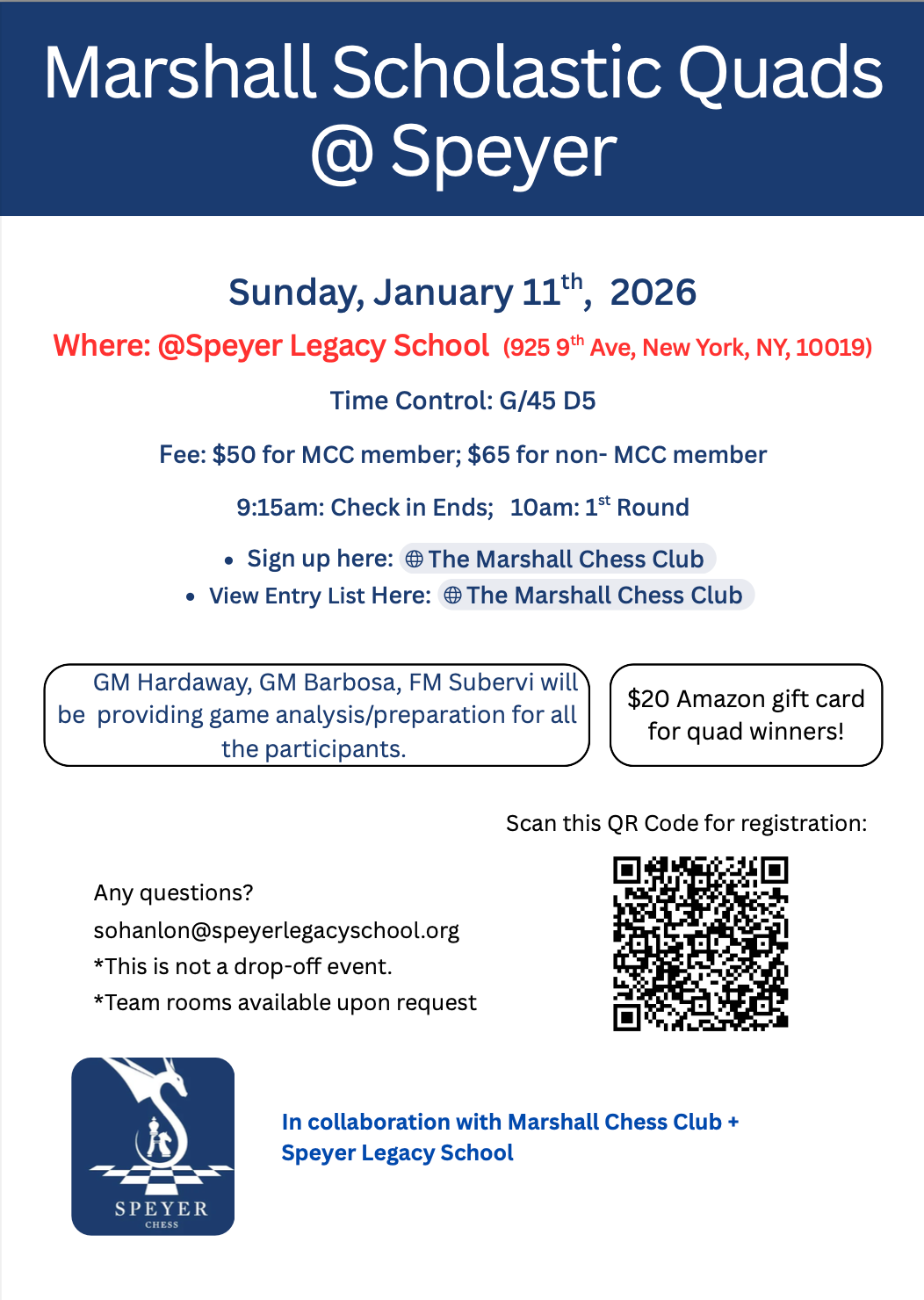 In other scholastic chess events news, The Marshall Chess Club is excited to announce our next offsite scholastic tournament in partnership with the Speyer Legacy School. This event will be held on Sunday January 11th, 2026. You can register your child in advance here.
