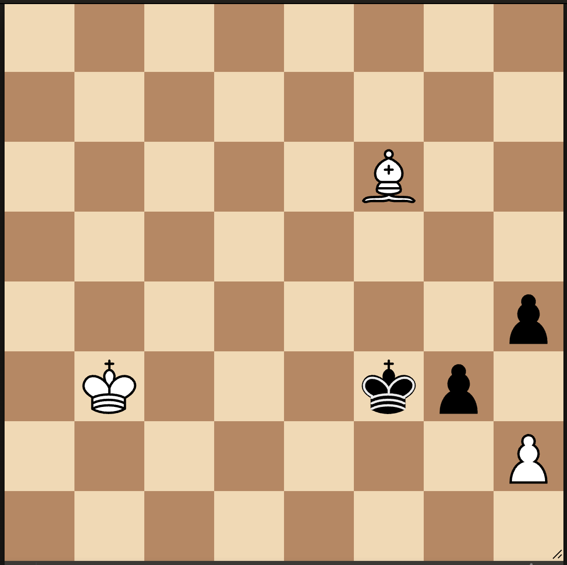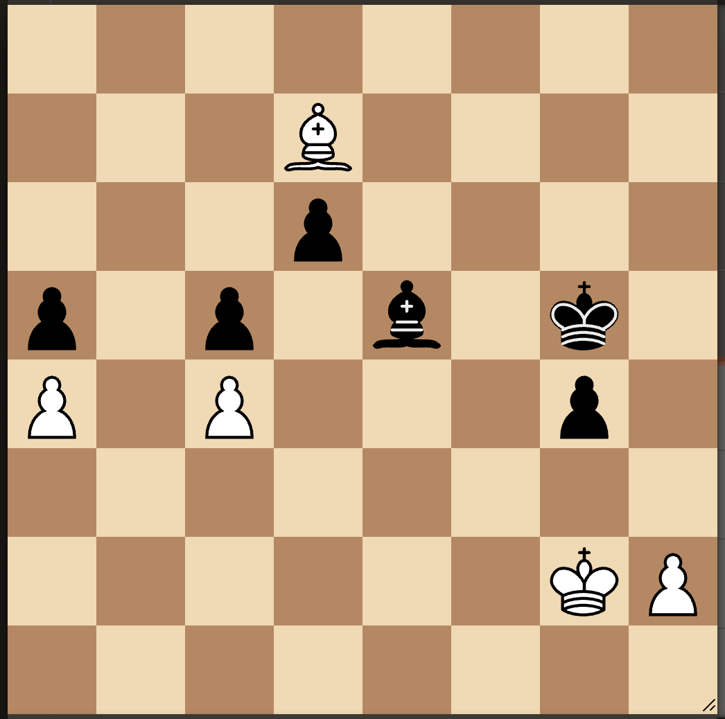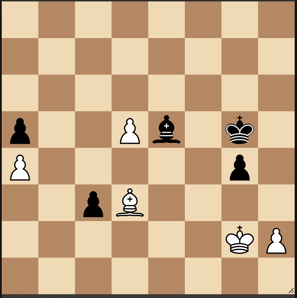 64. Be5 g2 65. Bd4 This is the difference: the black king is now far away from the promotion square g1. 65…Ke2 66. Kc2 Kf1 67. Kd3 g1=Q 68. Bxg1 Kxg1 69. Ke3 Kxh2 70. Kf2) (61... Kf2 62. Kxa4 Kg2 (62... h4 63. Bxh4+ {with check.)) 62. Kxa4 h4 (Or 62... Kg2) 63. Kxb3 g3 64. hxg3 h3 White resigned. 0-1) 53... bxa3 54. Kc3 Again, the king should approach the a-pawn with care. (54. Kc1 Bf5 55. Be7 Kc6 56. Bxa3 (56. Kd2 a2 57. Bf6 h4 with threats on both sides.) 56... h4