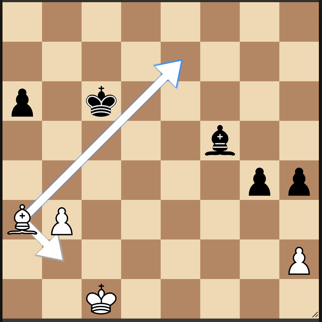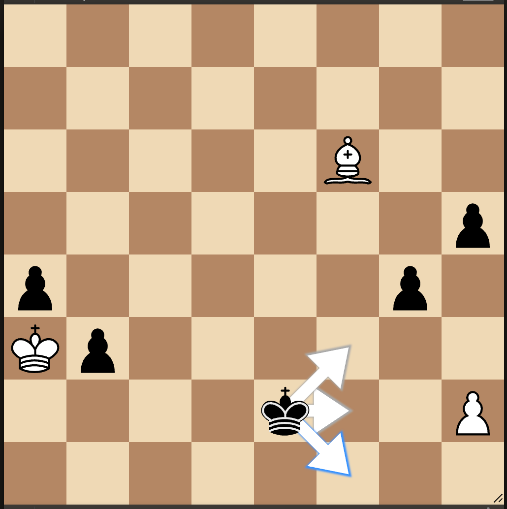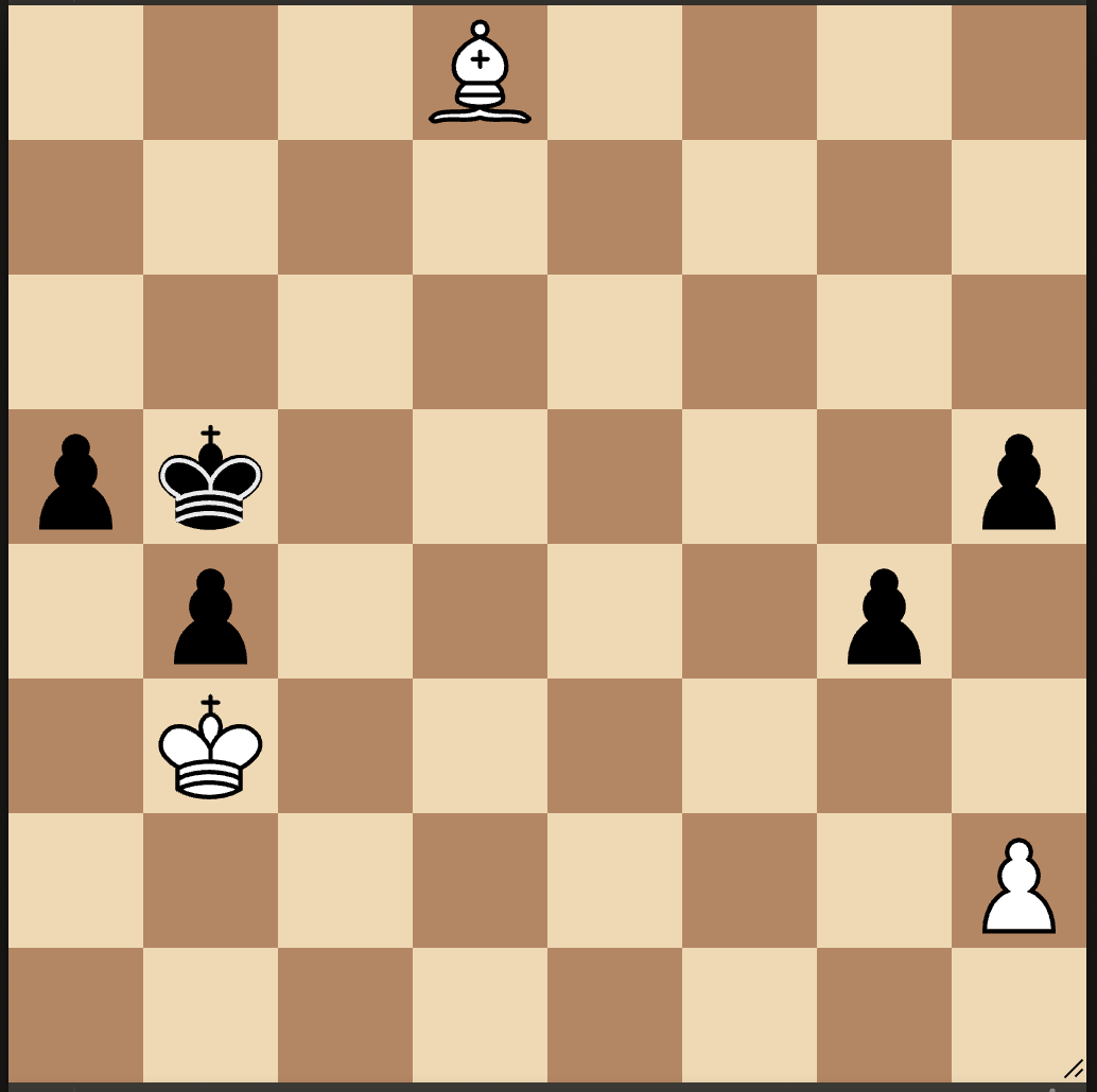 64. Be5 g2 65. Bd4 This is the difference: the black king is now far away from the promotion square g1. 65…Ke2 66. Kc2 Kf1 67. Kd3 g1=Q 68. Bxg1 Kxg1 69. Ke3 Kxh2 70. Kf2) (61... Kf2 62. Kxa4 Kg2 (62... h4 63. Bxh4+ {with check.)) 62. Kxa4 h4 (Or 62... Kg2) 63. Kxb3 g3 64. hxg3 h3 White resigned. 0-1) 53... bxa3 54. Kc3 Again, the king should approach the a-pawn with care. (54. Kc1 Bf5 55. Be7 Kc6 56. Bxa3 (56. Kd2 a2 57. Bf6 h4 with threats on both sides.) 56... h4