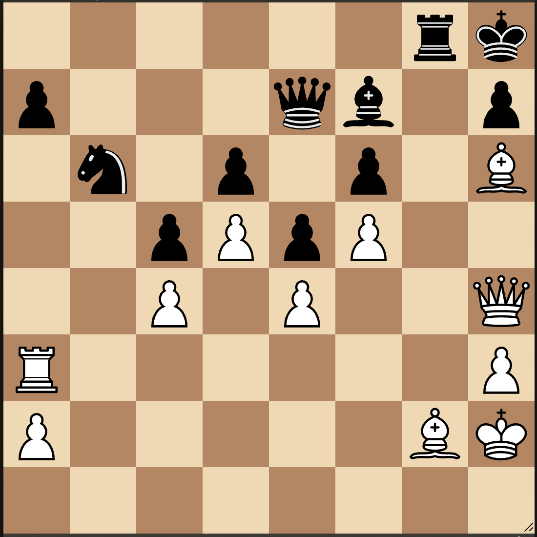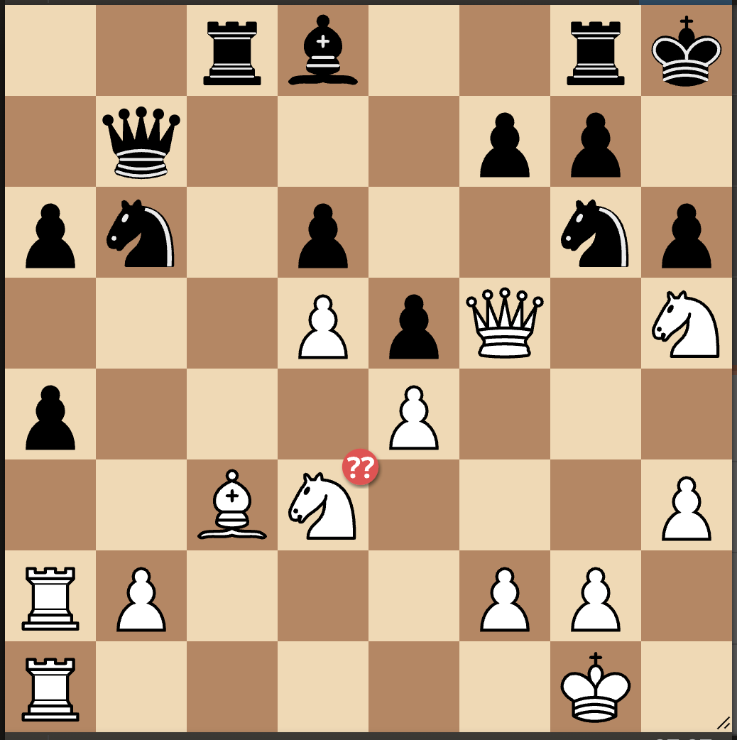 I thought for a long time about how to protect this pawn. I considered Rb1 for a while to attack b7, but then I lose a2 and it felt like too much. I also considered d5, but I wasn’t ready to close up my light-squared bishop, nor to make a bunch of trades. I didn’t love placing my queen in the line of Black’s bishop, but it felt more or less safe due to it adding extra pressure to Black’s queenside pawn structure. I felt I could induce some weaknesses here.