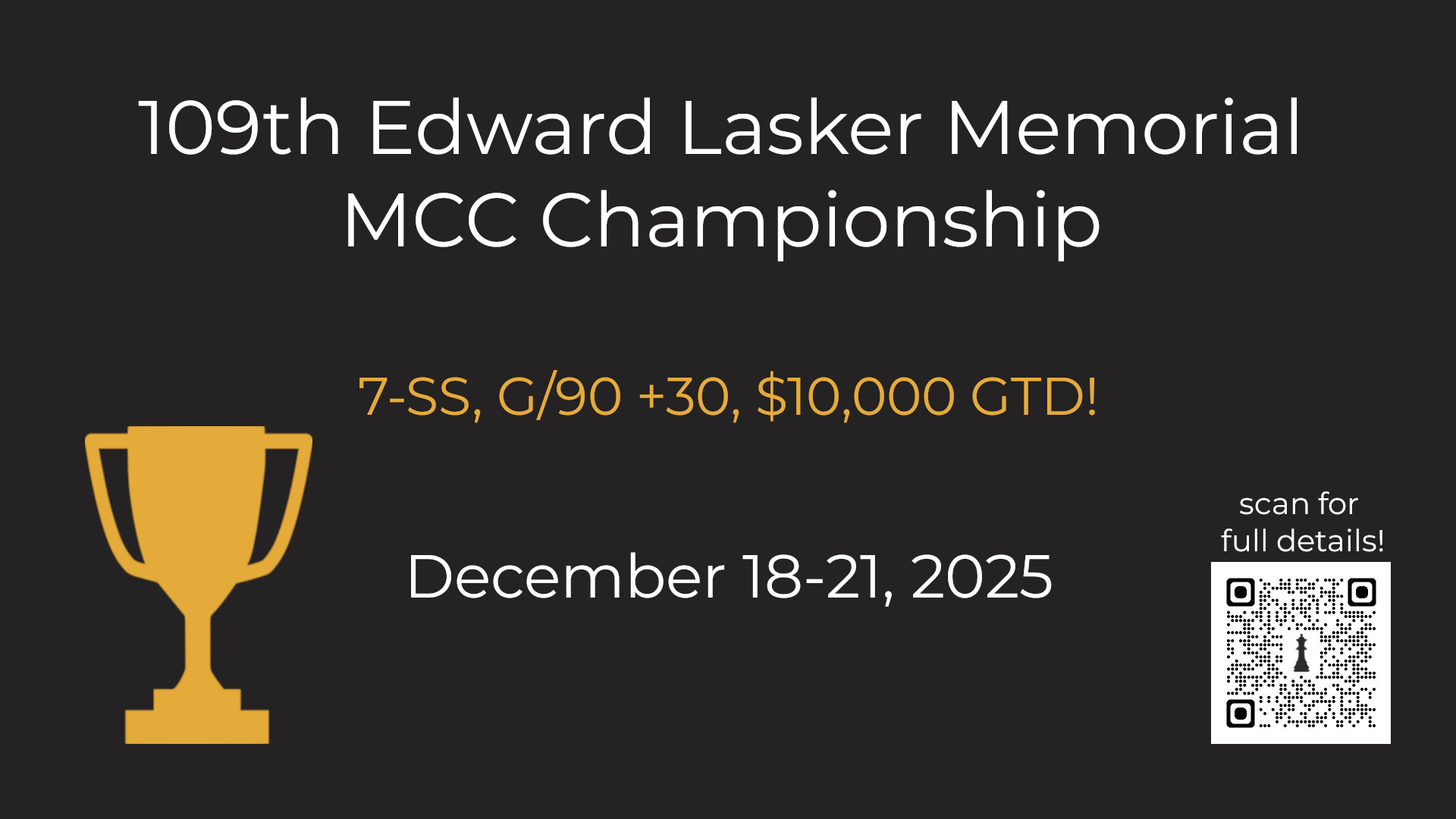 We are now entering the final stage of 2025 with our 109th Edward Lasker Memorial Club Championship, December 18-21