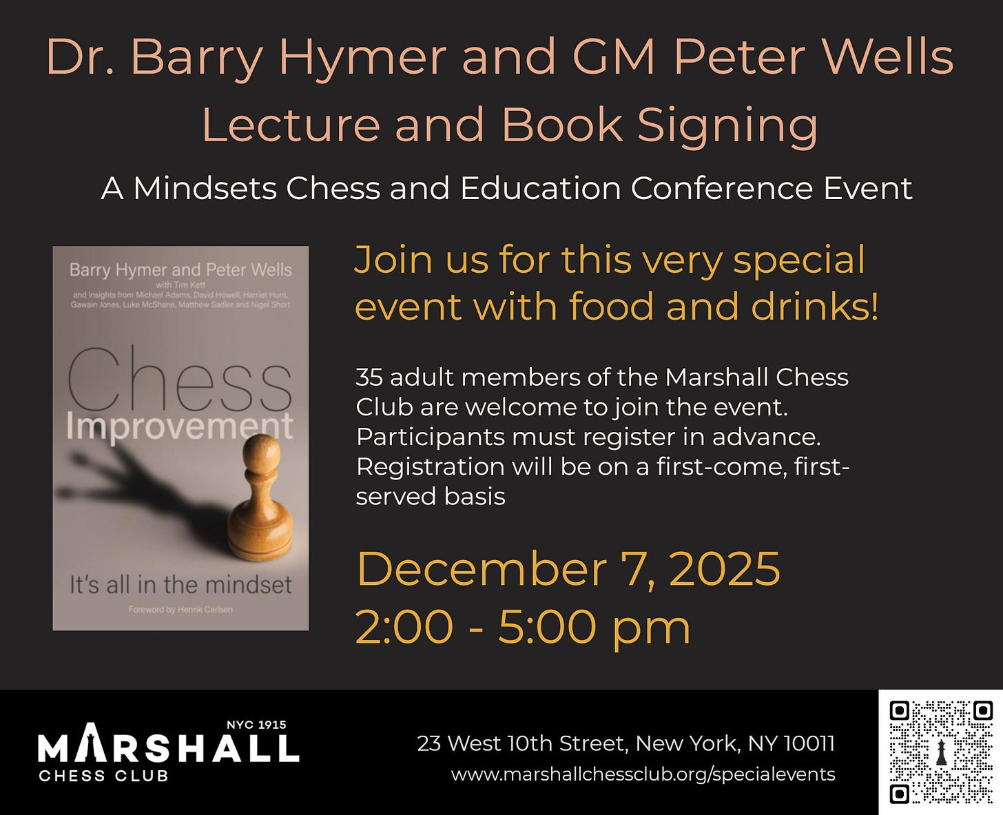 Looking ahead on the calendar we have an action packed month of events, starting with a lecture and book signing on Sunday, December 7 featuring Dr. Barry Hymer and GM Peter Wells who will be discussing their book “Chess Improvement: It’s all in the mindset” as part of the Education Conference Event.