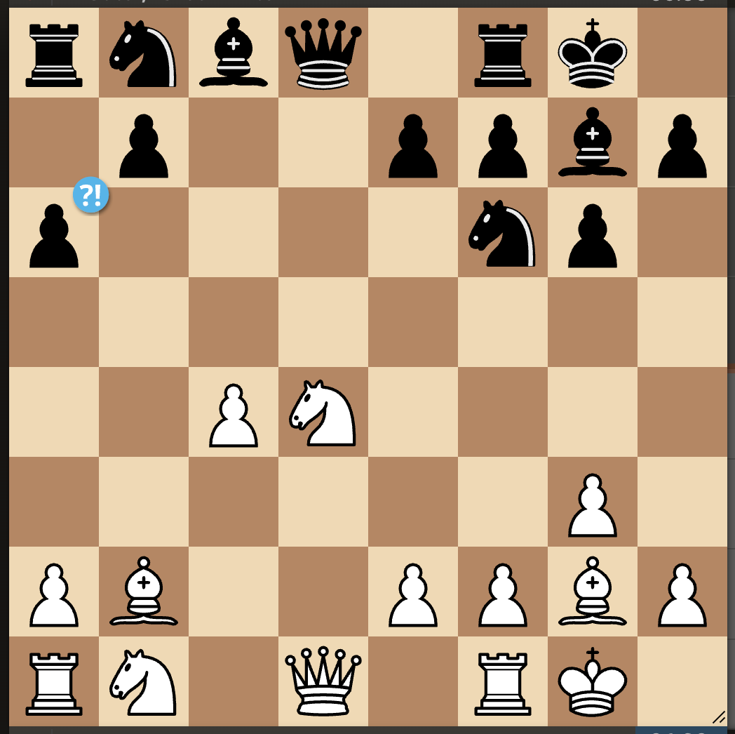 11. Nc3! I was very happy I found this move. Since I thought that the main idea of a6 was to be able to play Qc7 or e5 without allowing Nb5, I tried to develop my pieces in a way to discourage both of these ideas for black, and that’s why Nc3 came to mind. 11... Qc7?! This move plays into my plan, so I was happy to see it. (11... e6 12. c5 (12. Ba3 Re8 13. Rb1))