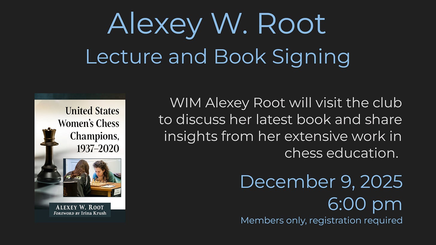On Tuesday, December 9, WIM Alexey W. Root will be giving a lecture and book signing as well as discussing and sharing insights from her extensive work in chess education.
