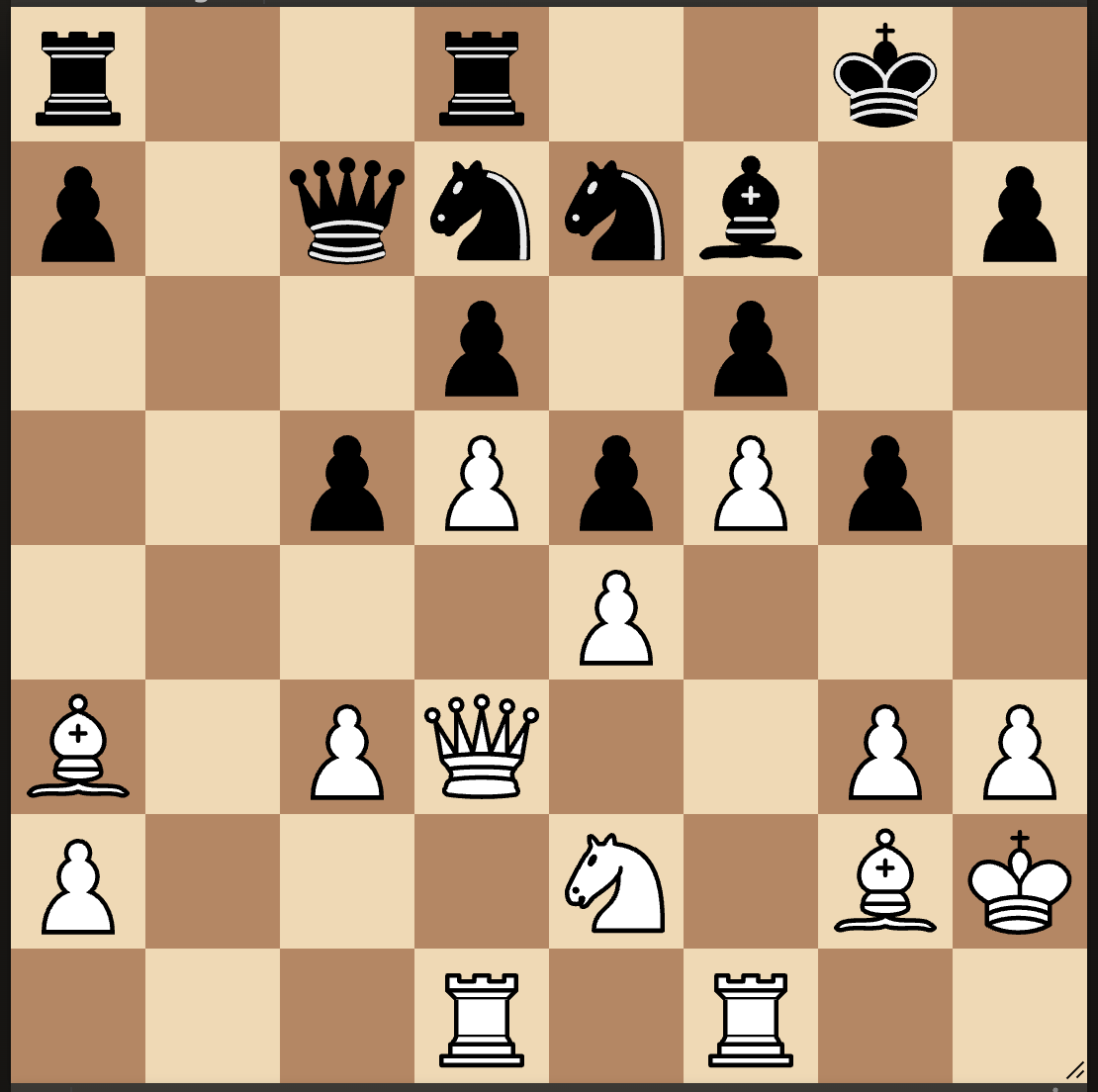 16. d5 bxc4 17. Qxc4 c5 18. f5 Keeping my light-squared bishop’s diagonal open for so long was a big asset that led to what I felt was positional superiority. But now I had to adapt; it now felt like the right time to push my pawns and control the light central squares.