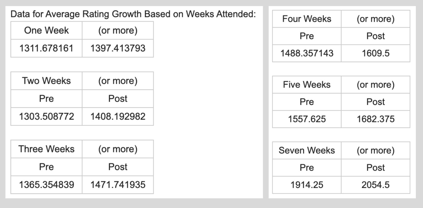 Not only that, our data shows that kids who attended one or more weeks of camp saw their ratings jump an average of 86-125 rating points, with the value increasing the more weeks they attended. The data below was compiled on November 24, and is based on a campers current live rating and live rating prior to attending their first camp.