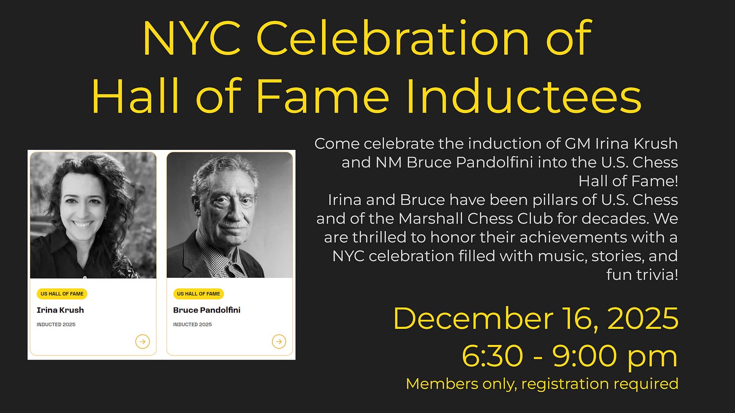 One of the most exciting events on our calendar will be held on December 16, when we will be joined by Chess Hall of Fame Inductees NM Bruce Pandolfini and GM Irina Krush, to celebrate their achievements and highlight some of the most memorable moments from their careers with a celebration filled with music, stories, and fun trivia.