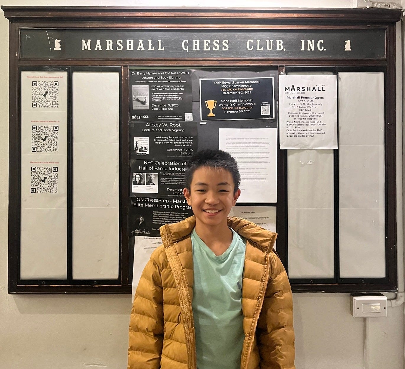 The Marshall Premier FIDE Open that concluded November 16 had 60 players registered and was won by GM Aleksandr Lenderman who scored a near-perfect 4.5 out of 5 to win the $1000 first place prize. GM David Brodsky, IM Tanitoluwa Adewumi, IM Justin Sarkar, and FM Aditeya Das scored 4 out of 5 to win $187.50 each, while CM Luc Hoffman and NM Elliott Goodrich scored 3.5 out of 5 to win $125 each.