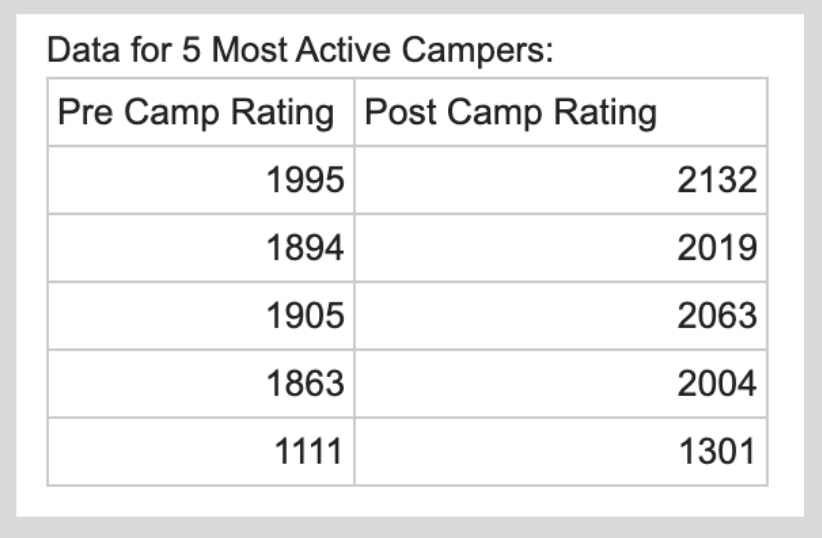That’s not all- our top five most active campers saw huge rating growth, with an average gain of 140 rating points since attending their first summer camp!